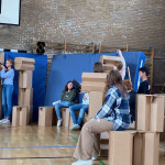 Die 9. Klasse kam leider über die Vorüberlegungen nicht hinaus, da dann ein plötzlicher hoher Krankenstand die Proben unmöglich machte. Die Idee war aber überaus vielversprechend. Es ging um die Entwicklung vom Affen zum Menschen, der schließlich seine Erfindungen nutzte, um andere Planeten zu erkunden, während die auf der Erde übrigen Menschen überlegten, ob es überhaupt so eine gute Idee war, die Bäume zu verlassen.