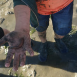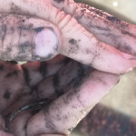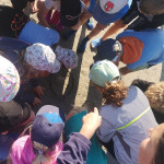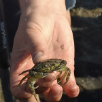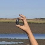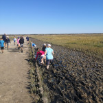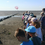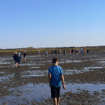 Los ging es durch die Ruhezone, die nur mit einem Wattführer oder einer Wattführerin betreten werden darf, durch die Salzwiesen hinein ins Watt. Dabei wurde auch der Weg der Zugvögel ins Auge genommen und die Leistung dieser kleinen gefiederten Freunde staunend anerkannt. Im Watt jedoch wurden alle Hemmungen gegen Schmutz schnell abgelegt. Mit den Fingern wurde nach Herzmuscheln gegraben, Dwarslooper auf die Hand genommen und Watt- und Gummibandwürmer angeschaut. Sogar eine Grundel, ein kleines Fischchen, und eine Garnele gab es zu bestaunen. Zurück ging es durch das hautfreundliche „Tiefwattbecken“, das anschließend alle Waschmaschinen auf eine harte Probe stellte.