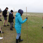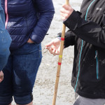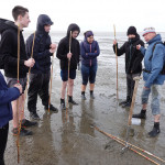 Um 08:30 Uhr trafen sich die Schüler und Lehrer der 9. und 10. Klasse zu einer Wattwanderung. Die Bedingungen waren mit Windstärke 8 herausfordernd. Uwe Garrels begann mit der Erklärung der physikalischen Gegebenheiten, die für die Entstehung des Watts vorhanden sein müssen. Nicht nur der Mond mit 2/3, sondern auch die Sonne ist zu 1/3 für die Gezeiten verantwortlich, sie liegen aber in ihrer Wirkung nicht im Takt. 2,70 m beträgt der Tidenhub an unserer Insel. Uwe Garrels demonstrierte dies mit zwei Stöckern, auf denen verschiedene Markierungen angebracht waren. Einige davon symbolisierten den Unterschied pro Stunde an auf- oder ablaufender Wasserhöhe. In den verschiedenen Stundenabschnitten ist ein unterschiedlicher Hub erkennbar.