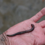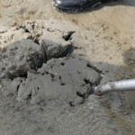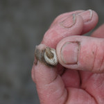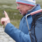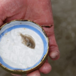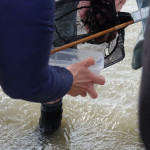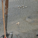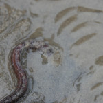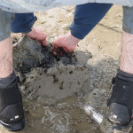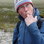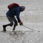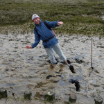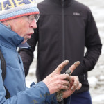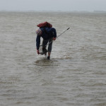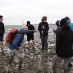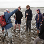Der Weg bis zum Priel war teilweise sehr beschwerlich da der Boden immer weicher wurde und nachgab. Mit diesen Eigenschaften führte Uwe Garrels die Haftkraft vor und besiegte seinen kritischen Kipppunkt. Im Priel graste er mit einem Kescher nach Fischen und konnte uns eine Flunder vorführen. Dazu erklärte er die verschiedenen Entwicklungsstadien des Fisches.