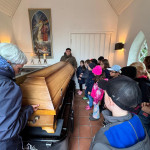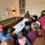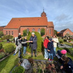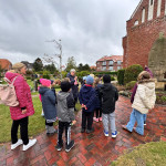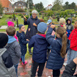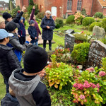 Die Klassen 3 und 4 besuchten vor den Herbstferien zusammen mit ihrer Religionslehrerin Kirsten Rottmann den Friedhof rund um die Inselkirche. Dort wurden sie von Frau Birgit Hecke-Behrends, die zur Zeit als Kurseelsorgerin und Kirchenraumpädagogin auf Langeoog die Inselpastorin unterstützt, bereits an der Eingangspforte erwartet. Neben einem ausführlichen Rundgang über den Friedhof konnten die Schüler- und Schülerinnen auch die Leichenhalle neben der Inselkirche begehen. Inselkirchenküster Dominique Seifert erklärte Abläufe, Rituale und Besonderheiten, wenn ein Insulaner/-in stirbt und dann hierher in einem Sarg zur Aufbahrung gebracht wird. Seit einigen Monaten übernimmt der im vergangenen Jahr gegründete „Letzte Reise e.V.“ diese wichtige Aufgabe nach dem Tod eines Insulaners, einer Insulanderin. Ein Urnengefäß, das bei Einäscherungen gebraucht wird, konnte von den Schüler/-innen ebenfalls in Augenschein genommen werden.  Beim Rundgang über den Friedhof zu beiden Seiten der Inselkirche wurden dann auch Grabinschriften und Symbole auf spielerische Weise gesucht und beschrieben und auch die Bedeutung von frischen Blumenkränzen auf Gräbern erklärt. Die Schüler/-innen hatten viele Fragen und zeigten großes Interesse an all den Aspekten, die mit dem Ende eines Menschenlebens und dem Gedenken von Angehörigen und Freunden zu tun haben. Ein großer Dank an Frau Hecke-Behrends !