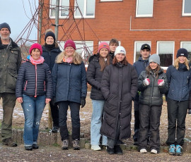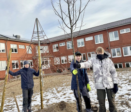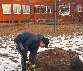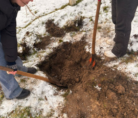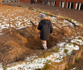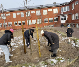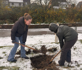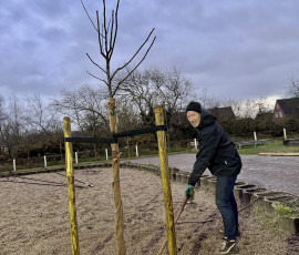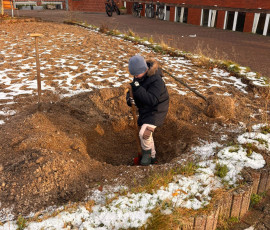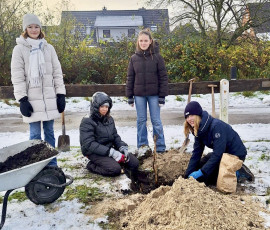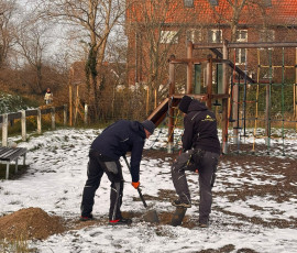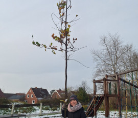 „Viele Hände – schnelles Ende“, anders lässt sich der Samstag nicht beschreiben. Schülerinnen, Schüler und Eltern waren dem Ruf nach Unterstützung von Umweltwissenschaftler Deff Westerkamp und Biologielehrerin Kirsten Rottmann gefolgt und brachten Kaiserlinde, Traubeneiche, Elsbeere und Ginkgo in den neuen Heimatboden auf dem Schulhof der Inselschule, auch sechs Efeupflanzen kamen in die Erde. Spitzahorn und Walnuss hatten bereits im Rahmen einer Zwei-Mann-Aktion einen neuen Platz gefunden, hier bekam Deff Westerkamp Unterstützung von Landschaftsarchitekt Marko Schurig. Dieser hatte nicht nur wertvolle Tipps zu Baumsorten beigesteuert, er wird auch noch einen Bergahorn und eine Eberesche aus seinem Garten spenden. Besonders letztere ist ein wahrer Vogelmagnet und für Insekten, Vögel und Säugetiere eine wertvolle Futterpflanze. Einige Blumenzwiebeln aus der beliebten Aktion „Tulpen für Brot“, die von Kirsten Rottmann im Rahmen der Schulgarten-AG eingepflanzt werden, wurden ebenfalls gesetzt und sollen im Frühling die neu gepflanzten Bäume umrahmen.