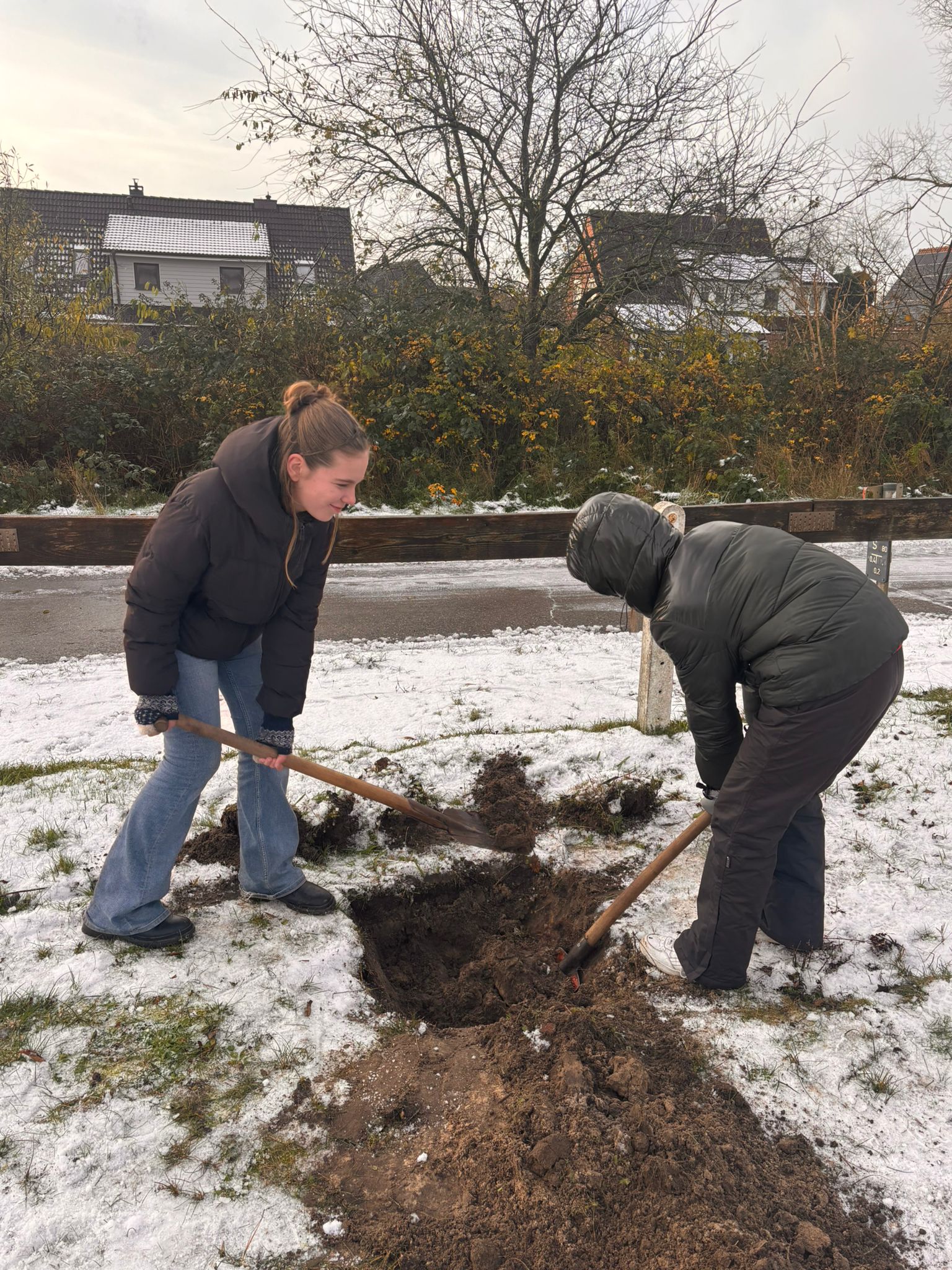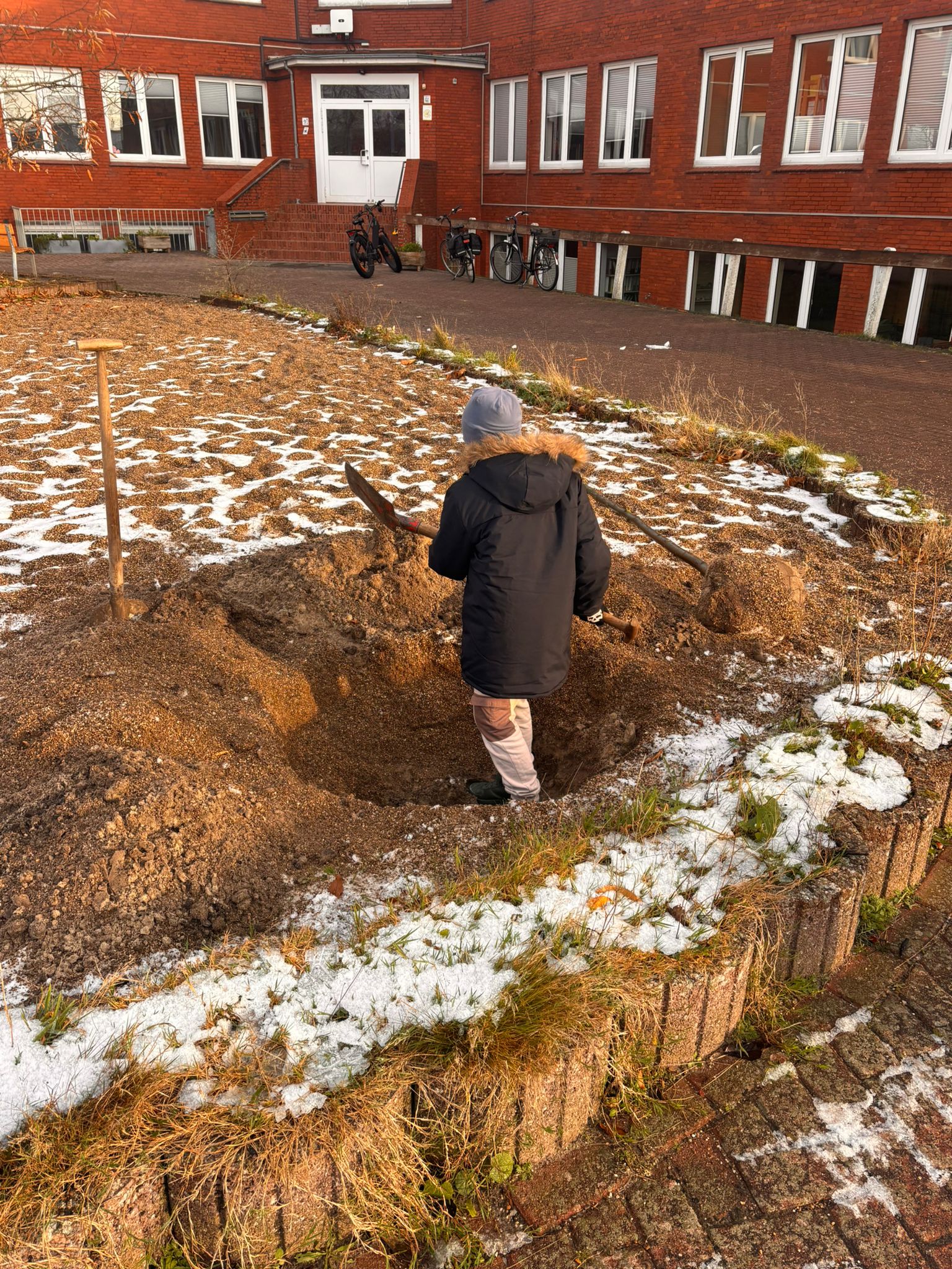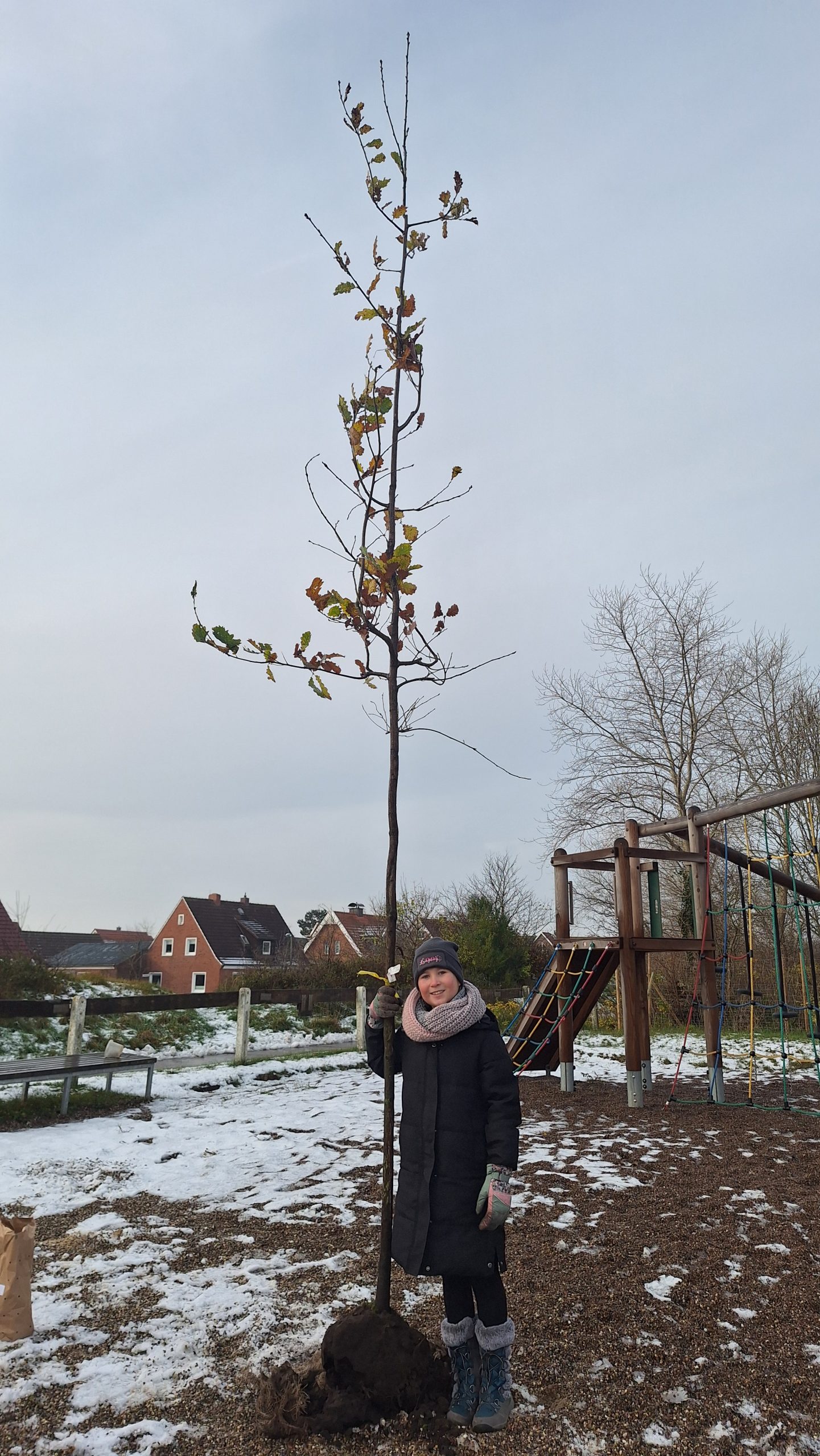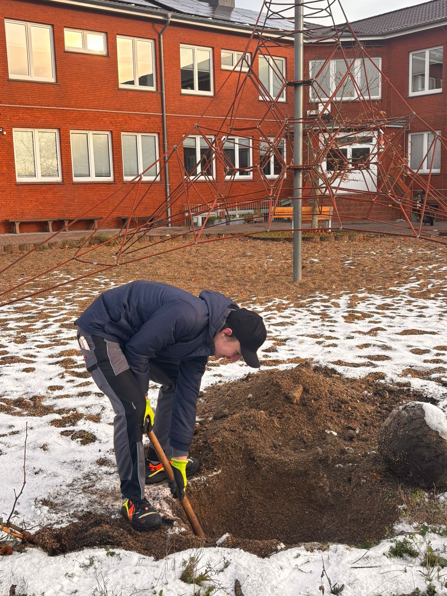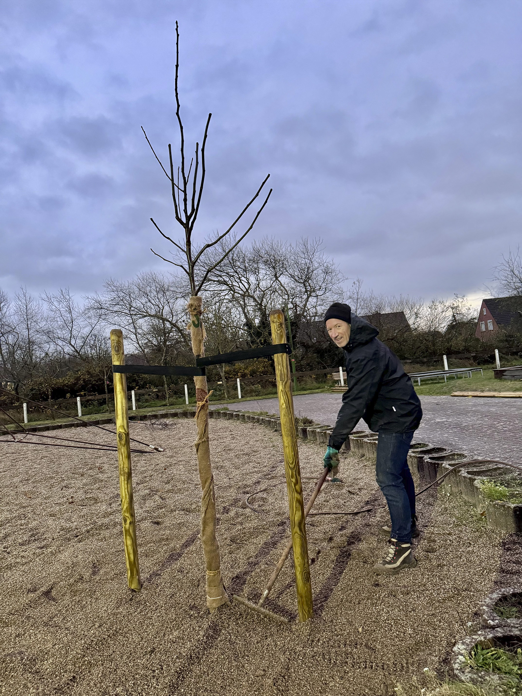 „Viele Hände – schnelles Ende“, anders lässt sich der Samstag nicht beschreiben. Schülerinnen, Schüler und Eltern waren dem Ruf nach Unterstützung von Umweltwissenschaftler Deff Westerkamp und Biologielehrerin Kirsten Rottmann gefolgt und brachten Kaiserlinde, Traubeneiche, Elsbeere und Ginkgo in den neuen Heimatboden auf dem Schulhof der Inselschule, auch sechs Efeupflanzen kamen in die Erde. Spitzahorn und Walnuss hatten bereits im Rahmen einer Zwei-Mann-Aktion einen neuen Platz gefunden, hier bekam Deff Westerkamp Unterstützung von Landschaftsarchitekt Marko Schurig. Dieser hatte nicht nur wertvolle Tipps zu Baumsorten beigesteuert, er wird auch noch einen Bergahorn und eine Eberesche aus seinem Garten spenden. Besonders letztere ist ein wahrer Vogelmagnet und für Insekten, Vögel und Säugetiere eine wertvolle Futterpflanze. Einige Blumenzwiebeln aus der beliebten Aktion „Tulpen für Brot“, die von Kirsten Rottmann im Rahmen der Schulgarten-AG eingepflanzt werden, wurden ebenfalls gesetzt und sollen im Frühling die neu gepflanzten Bäume umrahmen.