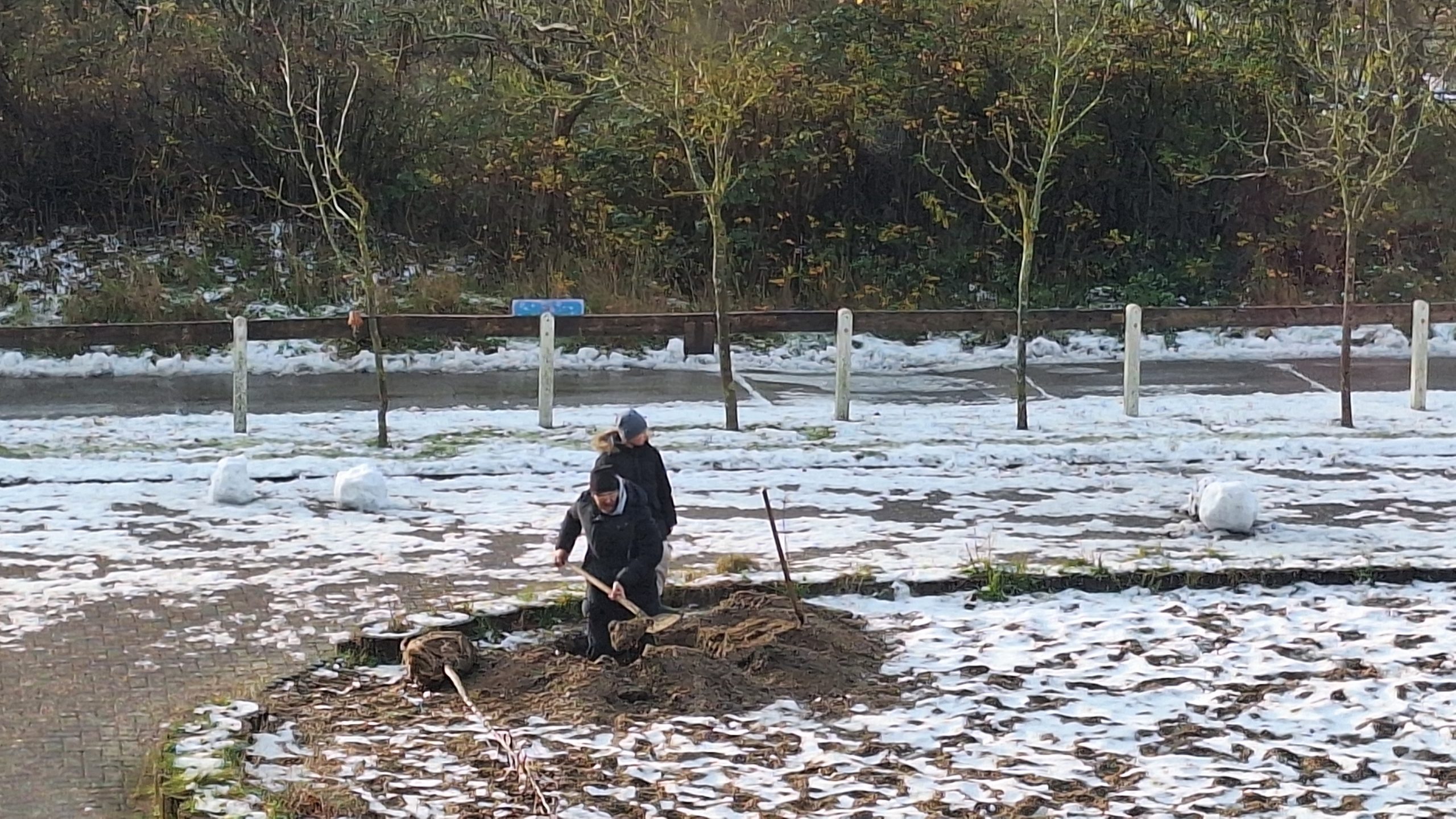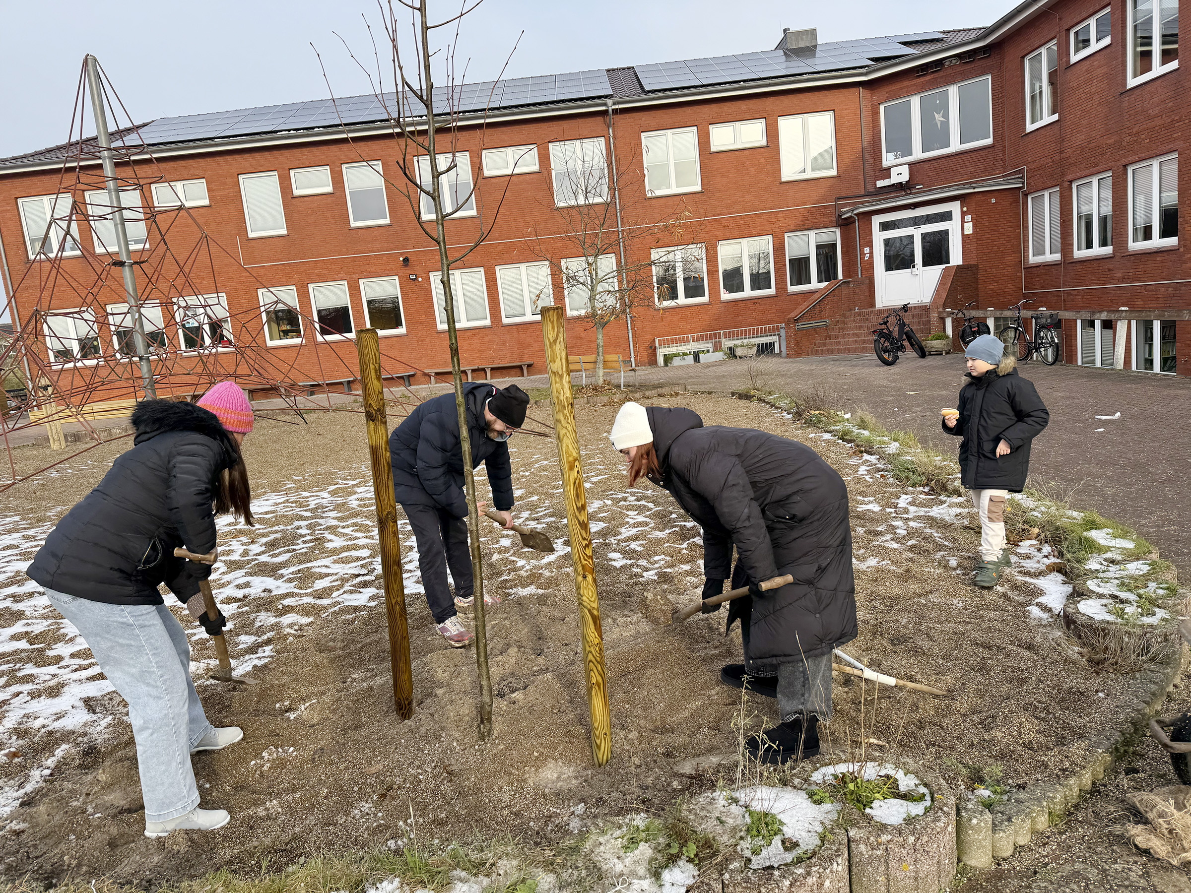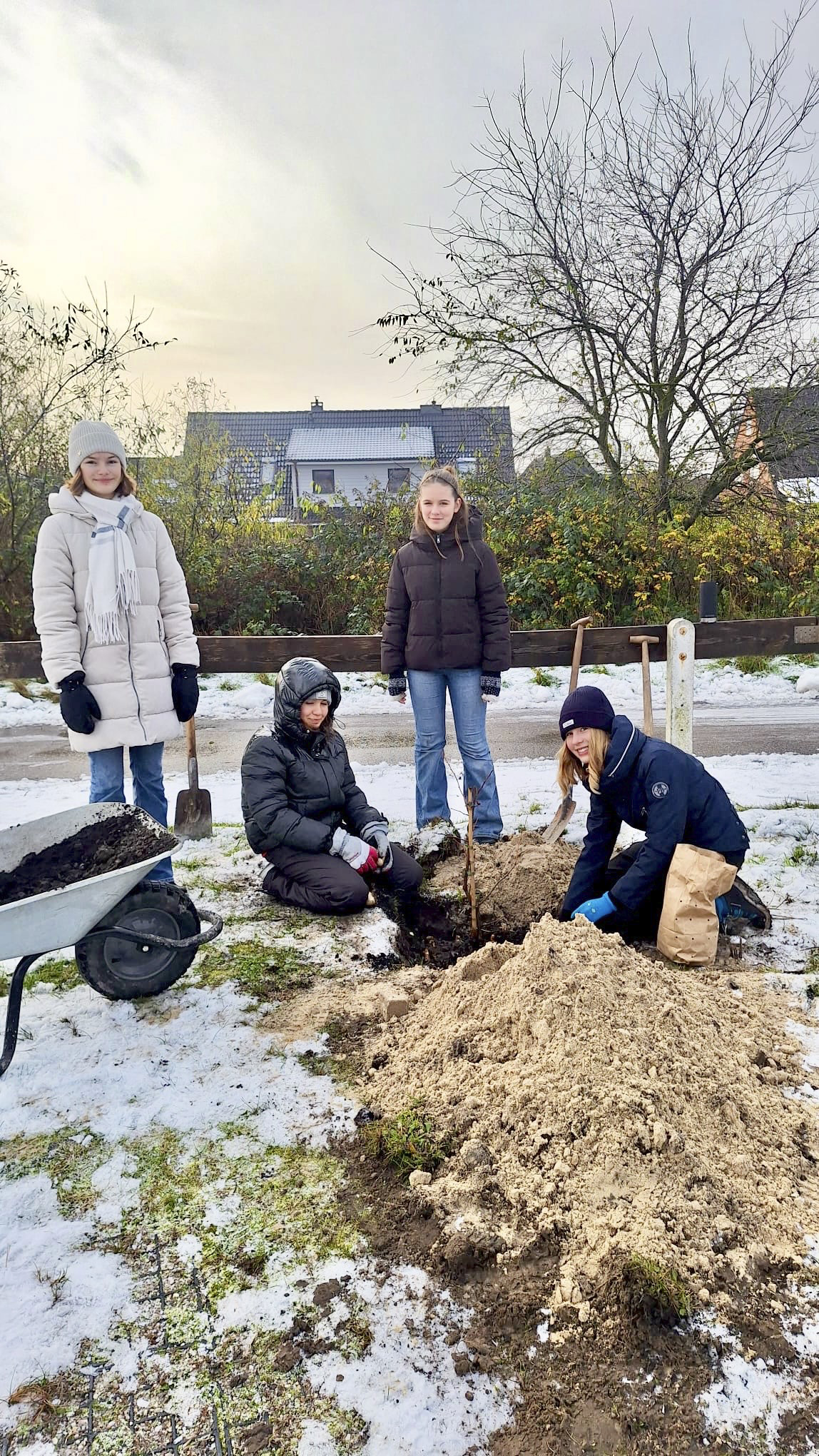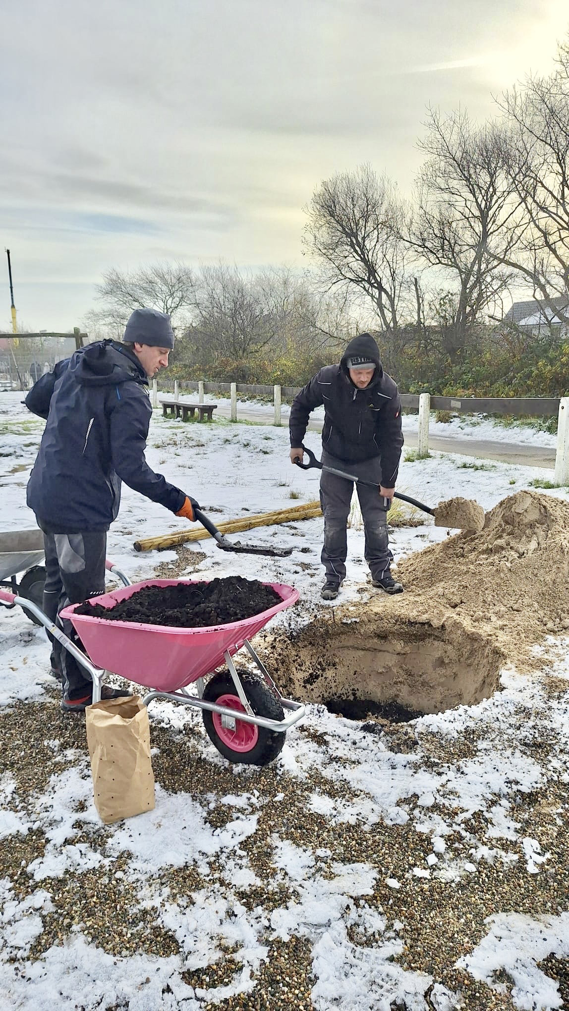 „Viele Hände – schnelles Ende“, anders lässt sich der Samstag nicht beschreiben. Schülerinnen, Schüler und Eltern waren dem Ruf nach Unterstützung von Umweltwissenschaftler Deff Westerkamp und Biologielehrerin Kirsten Rottmann gefolgt und brachten Kaiserlinde, Traubeneiche, Elsbeere und Ginkgo in den neuen Heimatboden auf dem Schulhof der Inselschule, auch sechs Efeupflanzen kamen in die Erde. Spitzahorn und Walnuss hatten bereits im Rahmen einer Zwei-Mann-Aktion einen neuen Platz gefunden, hier bekam Deff Westerkamp Unterstützung von Landschaftsarchitekt Marko Schurig. Dieser hatte nicht nur wertvolle Tipps zu Baumsorten beigesteuert, er wird auch noch einen Bergahorn und eine Eberesche aus seinem Garten spenden. Besonders letztere ist ein wahrer Vogelmagnet und für Insekten, Vögel und Säugetiere eine wertvolle Futterpflanze. Einige Blumenzwiebeln aus der beliebten Aktion „Tulpen für Brot“, die von Kirsten Rottmann im Rahmen der Schulgarten-AG eingepflanzt werden, wurden ebenfalls gesetzt und sollen im Frühling die neu gepflanzten Bäume umrahmen.