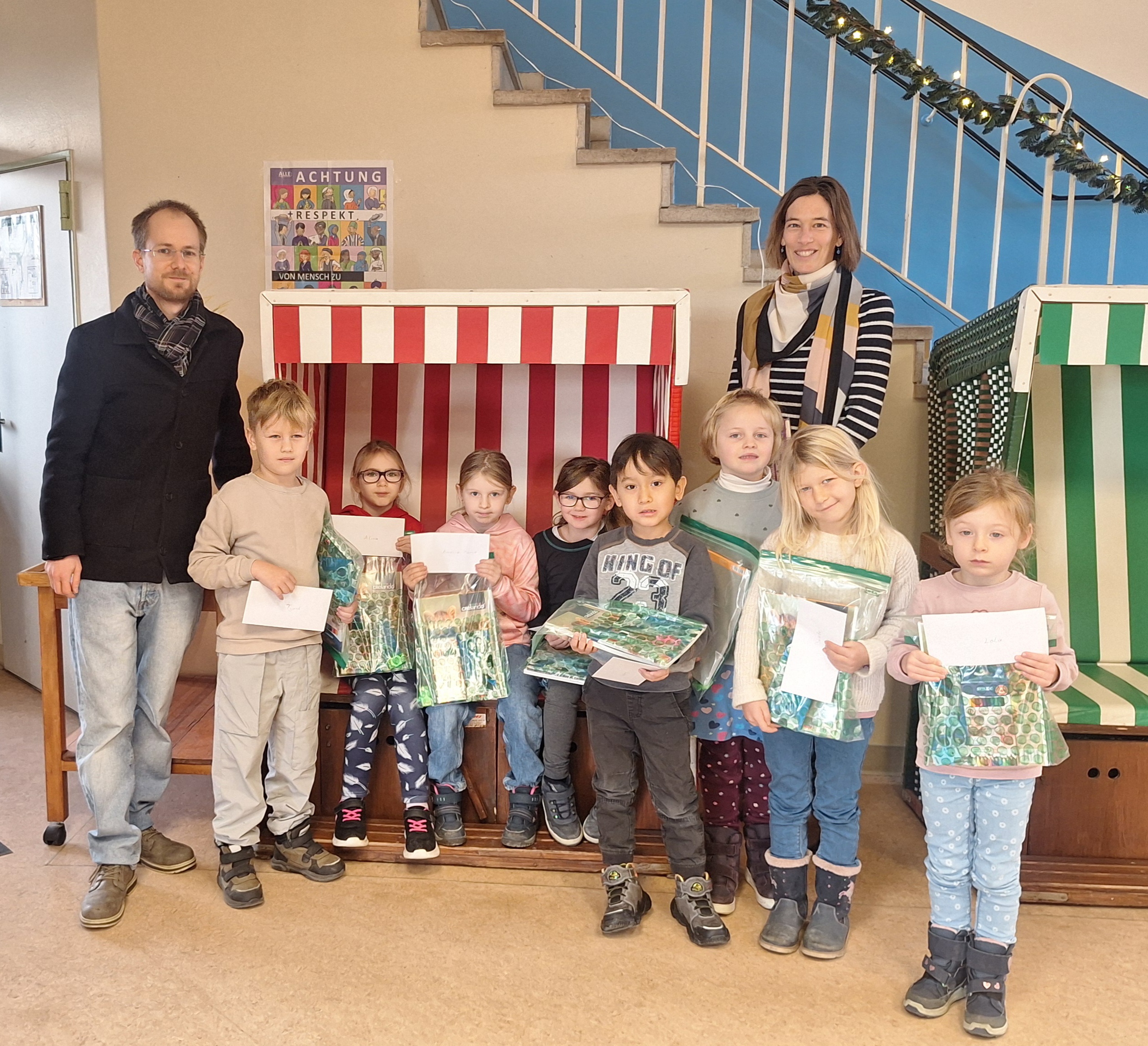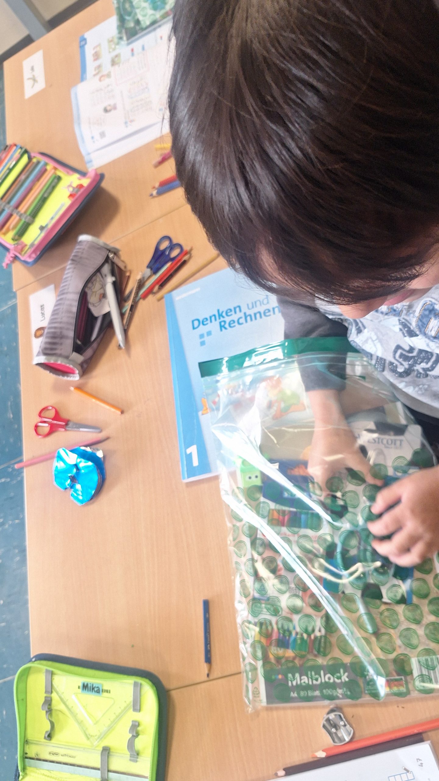 Das Schuljahr ist nun schon einige Wochen im Gange und wie es immer so ist, werden viel genutzte Gegenstände auch mal verbummelt. Umso mehr freuten sich also die neun Erstklässler zusammen mit Klassenlehrerin Kirstin Müsch und Schulleiterin Petra Ahrenholz über Blöcke, Anspitzer, Buntstifte, Schere und Aufkleber, was in der nächsten Unterrichtsstunde gleich zum Einsatz kam. Außerdem bekam jedes Kind einen persönlichen Brief. Klassenlehrerin Kirstin Müsch freute sich ebenfalls über eine nette Aufmerksamkeit, die gleich nützliche Anwendung im Schulvormittag fand.
