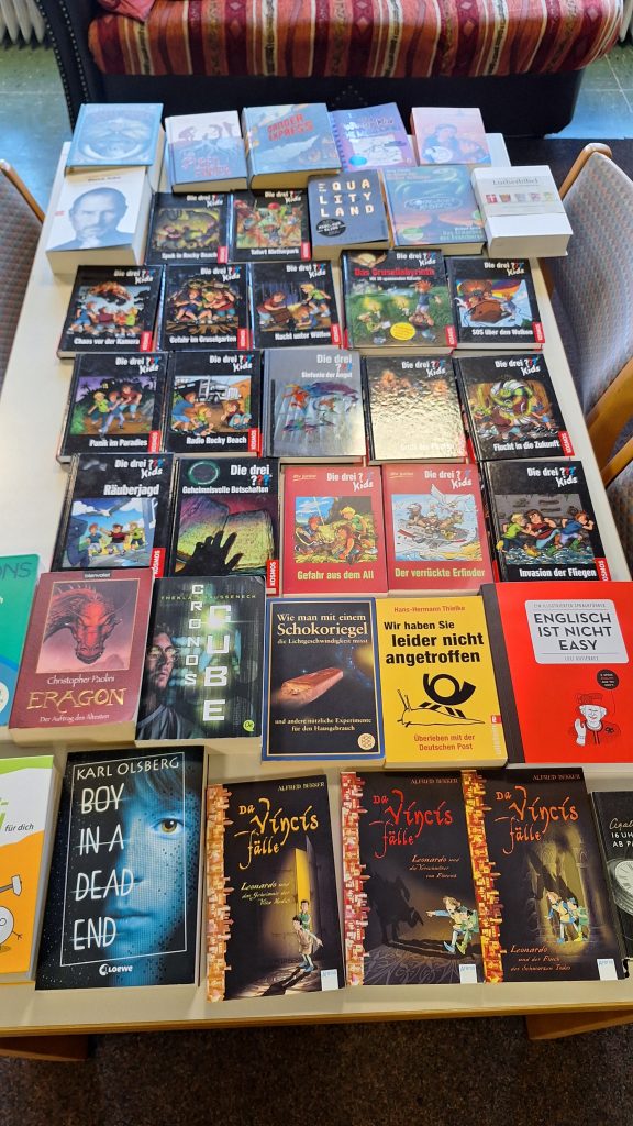 Pünktlich zum kalten Wetter trudelte wieder eine gigantische Bücherspende in der Inselschule ein. Kai, Nils und Jan Wettstein hatten zuhause ausgemistet und ihrer ehemaligen Schule fast 40 tolle, super erhaltene Kinder- und Jugendbücher vermacht.